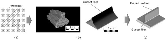 Braiding pattern of a gusset filler (a); CT image and sketch of a gusset filler (b); and gusset filler in draped preform (c).