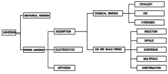 In physicochemistry, adhesion is one of the most difficult phenomena to define unambiguously. According to [1,2,3,4,5], it is a series of phenomena that may occur at the contact of surfaces of adjacent materials. In Latin, adhesio means adhering, sticking [3]. Nevertheless, such a general definition explains this phenomenon to a very small extent. The main reason that makes it impossible to define adhesion in an unambiguous way is its very complex nature. This is due to the fact that adhesion depends on many factors [2,3,6]. Importantly, the individual definitions complement each other. Over the years, the research on adhesion, the development of which was possible owing to the development of the field of science, the so-called surface physicochemistry [1,2,7], have resulted in an increasingly consistent but also multi-directional definition of adhesion [4,5,8]. The definition of McBain and Hopkins [9] was developed as one of the first. It was based on an adhesion model showing the mutual interlocking of two surfaces. Further analyses, the development of new research methods and a more detailed understanding of adhesion allowed extending this theory. Hence, several models of adhesion are adopted in the literature, along with the main factors determining them. The most common division in the literature is presented in Figure 1 [3,4,6].