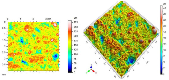 For the concrete surfaces prepared according to the described scheme, the roughness parameters were tested using the T8000 RC120-400 contact profilometer by Hommel-Etamic (Charlotte, NC, USA) (Figure 4). The measurements were carried out on 5 × 5 cm area sections. Each measurement consisted of 48 movements of the profilometer over the surface of the samples. Owing to the built-in control module and the profilometer which records the movement of the needle on the surface of the samples, three-dimensional images of the surfaces prepared in this way were obtained for comparison. It was assumed that when the roughness and specific surface—which is filled by the adhesive while sticking the tape fragments—are differentiated, the results of adhesion of the samples to concrete will also vary. The results of these analyses will be presented in a further part of the article.