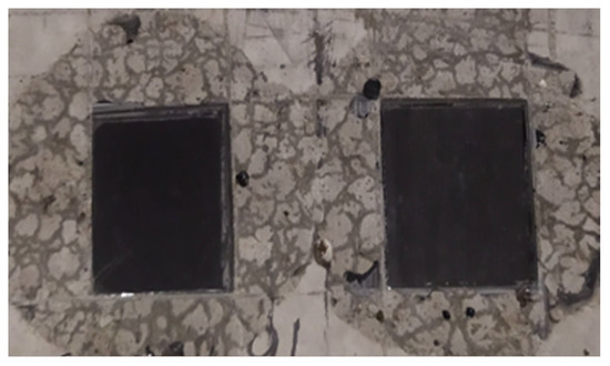 During maturation, the samples were stored in a water bath. After 28 days, they were dried, and their mechanical parameters were examined according to [80]. Then, the adhesion test of 3.0 × 2.5 cm CFRP tape pieces (Figure 3) was carried out on identical samples that were not used when determining the strength class. For this purpose, 1.2 mm thick Sika CarboDur S CFRP tape (Sika Poland, Warsaw, Poland) was used. The samples were glued to the surfaces of the cubes, which were in contact with the walls of the mold (Figure 3). The following methods of concrete surface preparation were selected for the tests: