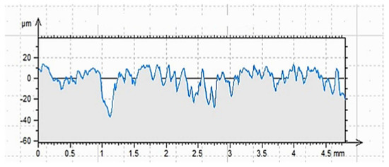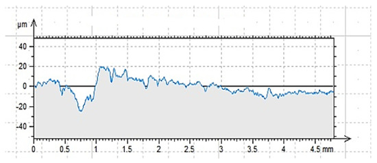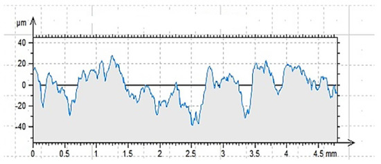 Regarding the last point, there are different methods of roughness testing. One of the most frequently used methods is contact profilometry [46,47,48]. During the examination, the image is obtained as a result of the needle moving over the tested surface. A needle with a diameter and radius appropriately selected for the unevenness of the substrate can be moved vertically and is connected to a module recording the value of displacement received as optical or electrical signals. In this way, the software creates an image of the surface, an example of which is shown in Figure 2.