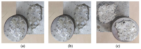 The adhesion of CFRP tape samples to the concrete was investigated using a Dynatest pull-off tester (Gainesville, FL, USA) with a load range of 0–25 kN (Figure 5a,b). Eight measurements were performed for each recipe. The test was carried out within 14 days of sticking the samples. The average thickness of the adhesive layer between the CFRP tape and the concrete surface was 0.5–0.6 mm. The samples were glued to concrete at the age of 360–400 days. The age of concrete at the time of testing resulted from the adopted assumption regarding the practical aspect of strengthening structural concrete and reinforced concrete elements. According to general rules, the elements for which load-bearing capacity has been weakened as a result of exceeding the permissible stresses are subject to strengthening. Strengthening may also be carried out in order to increase the load-bearing capacity when the purpose of the structure is changed. Therefore, fresh concrete is not subject to strengthening, e.g., 28 days after molding. The adopted assumptions were intended to partially refer to the actual conditions for strengthening this type of elements. The peel stress was determined as the quotient of the peel force and the surface area of the CFRP tape sample. It is worth noting that all the conducted studies required strictly defined humidity and temperature conditions and a high level of accuracy.