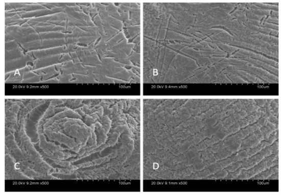 SEM images of beads at 500× magnification: Ca-Alg2 (A), Ca-Alg2/GO5 (B), Ca-Alg2/GO10 (C), Ca-Alg2/GO20 (D).