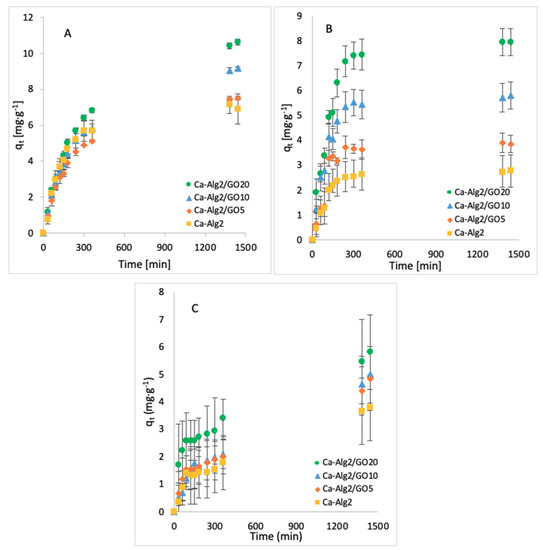 Kinetic parameters were studied using 0.05 g of Ca-Alg2, Ca-Alg2/GO5, Ca-Alg2/GO10 or Ca-Alg2/GO20 dried beads. The three most common models were examined as to their fit to the experimental data [44]. The adsorbate capacity qt (mg g−1) at time t was calculated using Equation (5):