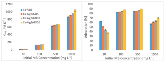 The adsorption percentage of MB at pH 7 was 62.9 ± 0.75%, which slightly increased up to 68.6 ± 0.7% at pH 10 and attained a maximum value (Figure 10A) when Ca-Alg2/GO20 beads were used. Similarly, the highest MB adsorptions were obtained at pH 10 with other beads. The adsorption percentage of FMTD showed a peak at pH 10 with for different types of beads, with the maximum of 49.2 ± 1.6% (Figure 10B) when Ca-Alg2/GO20 was used. Therefore, the adsorption of cationic molecules, MB and FMTD, increases with higher pH solutions until they reach a pH of 10, then it starts to decrease. This observation can be explained by looking at the pKa values of the analytes and Ca-Alg2/GO20 beads. At pH 10, FMTD is in the neutral form, since its pKa value is 6.98 [50], and it possess lower water solubility, thereby enhancing the adsorption process at this pH. MB still possesses a positive charge at pH 10; however, GO has an increased negative charge at pH 10 since the phenolic groups of GO now becoming ionized (GO pKa = 4.3; 6.6; 9.8 all acid groups and 50% of GO phenolic groups will be ionized) [51], enhancing the charge attraction between MB and the adsorbent, which explains the larger adsorption capacity between Ca-Alg2/GO20 and Ca-Alg2 in Figure 10A.