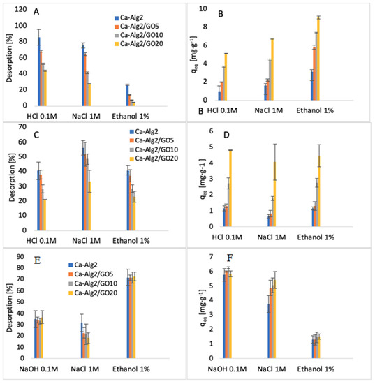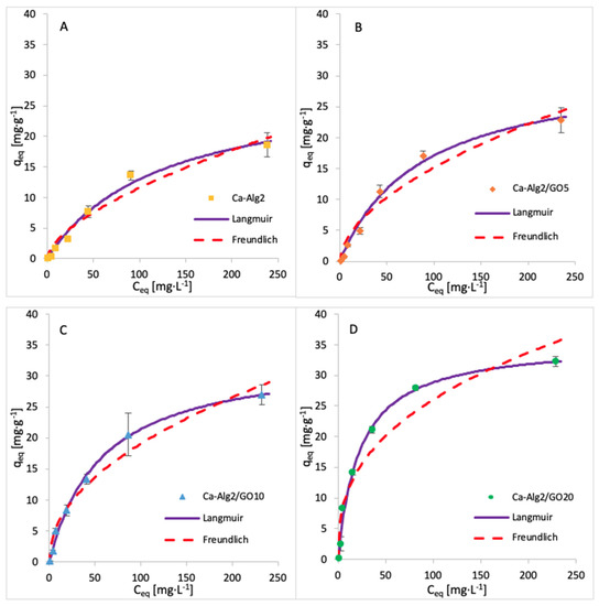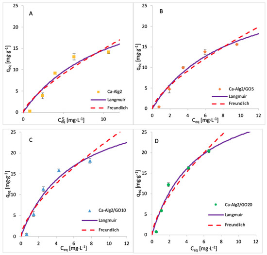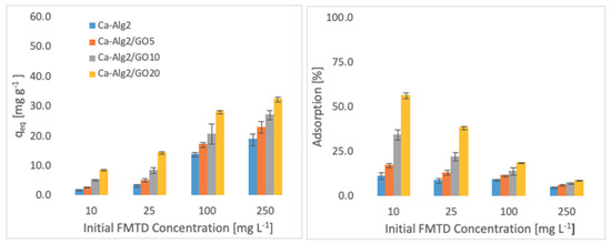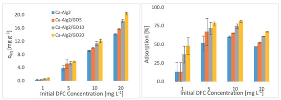 The adsorption gradually increased with the contact time and slowed down progressively to reach an equilibrium after 24 h. An increased adsorbate capacity was achieved with an increased concentration of GO in the composites. Ca-Alg2/GO20 beads were the most efficient for the adsorption of each compound, as expected. For the adsorption of MB, Ca-Alg2/GO10 and Ca-Alg2/GO20 beads caused a significant improvement in the adsorbate capacity by increasing it from 6.91 ± 0.83 mg g−1 to 9.18 ± 0.08 and 10.63 ± 0.17 mg g−1, respectively, in comparison to Ca-Alg2 (control), with the p values of 0.034 and 0.023. For the adsorption of FMTD, regardless the level of GO, Ca-Alg2/GO composites showed a significant improvement (p < 0.05) in adsorbate capacity from 2.78 ± 0.34 mg g−1 to a maximum of 7.95 ± 0.54 mg g−1. On the other hand, for the adsorption of DFC, no significant enhancements were seen (high level of error bars), which is attributed to the molecular limitations of DFC.