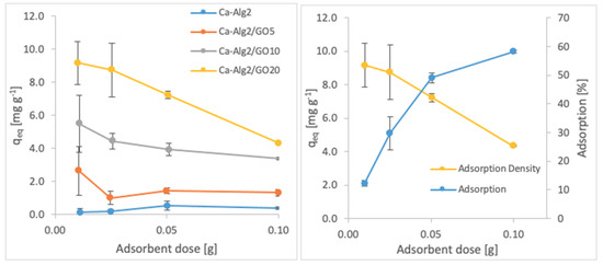 The effect of the adsorbent dose was studied using 0.01, 0.025, 0.05 and 0.1 g of Ca-Alg2, Ca-Alg2/GO5, Ca-Alg2/GO10 or Ca-Alg2/GO20 dried beads.