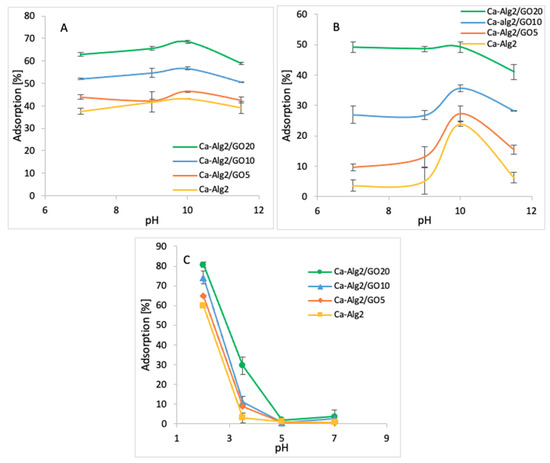 On the other hand, for the anionic molecules, DFC, the highest adsorption percentage was observed as 96.1 ± 1.7% (Figure 10C) when Ca-Alg2/GO20 beads were used at pH 2. The adsorption percentage showed a sudden drop when the pH level increased to 3.5, and further increases in pH level had a negative impact on adsorption for four different bead types. The observed decrease in the adsorption of diclofenac at higher pH is a consequence of the non-ionized to ionized form of diclofenac (pKa = 4.0), alginate (pKa mannuronic = 3.38 and guluronic acid = 3.65 [52]) and GO. At pH 2, the ratio of non-ionized to ionized diclofenac is 100:1, that to alginate is 45:1 (pKa 3.65), and that to GO is 200:1 (see Appendix E). These ratios change at pH 3.5 to 3.16:1, 1.4:1 and 6.3:1 for diclofenac, alginate and GO, respectively. Thus, diclofenac, alginate and GO gain negative charge, and as a consequence repulsion occurs. Furthermore, as diclofenac becomes negatively charged, its water solubility is significantly enhanced, consequently reducing adsorption [53,54]. The calculation of the pKa values of the pollutants and adsorbents is given in Appendix E.