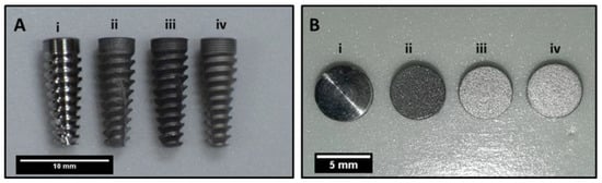 - Taborelli, M.; Jobin, M.; François, P.; Vaudaux, P.; Tonetti, M.; Szmukler-Moncler, S.; Simpson, J.P.; Descouts, P. Influence of surface treatments developed for oral implants on the physical and biological properties of titanium. (I) Surface characterization. Clin. Oral Implant. Res. 1997, 8, 208–216. [Google Scholar] [CrossRef] [PubMed]