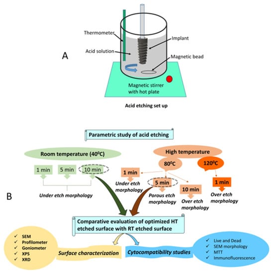 - Chauhan, P.; Koul, V.; Bhatnagar, N. Effect of acid etching temperature on surface physiochemical properties and cytocompatibility of Ti6Al4V ELI alloy. Mater. Res. Express 2019, 6, 10. [Google Scholar] [CrossRef]