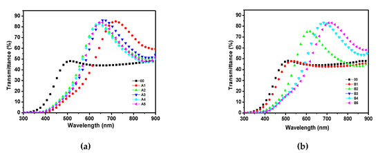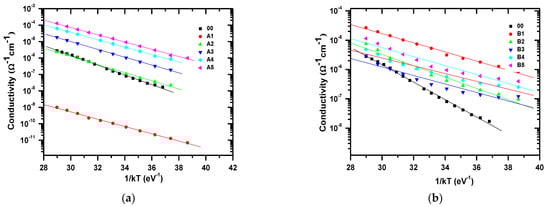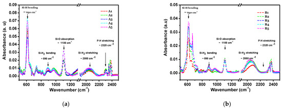 Figure 1 shows the FTIR spectra for a-Si:H in the second and third series of a-Si:H thin films (Figure 1a shows n-type films with different processes, A1–A5, and Figure 1b shows p-type films with different processes, B1–B5). The spectrum of a-Si:H consisted of typical absorption bands for different types of hydrogen bonding to nitrogen and silicon and silicon−nitrogen-related bands. One can observe a peak around 640 cm−1, which corresponds to Si–H rocking/waging modes, and the band around 800–950 cm−1 is related to SiH2 or SiH3 bonding with low intensity. The main trend is that the intensity of the bands assigned to SiHn decreases with the increase in the ammonia content in PECVD. The spectra of transmittance with respect to the wavelength of the doped n-type films are shown in Figure 2a, and in Figure 2b for the p-type films. Here, it is observed that, in the range from 300 to 550 nm, the intrinsic film shows a greater transmittance. However, from 550 to 900 nm, the doped films, either n-type or p-type, show almost double the transmittance in comparison to the intrinsic film. The refractive index with respect to the wavelength is shown in Figure 3 (for doped n-type films in Figure 3a, and for p-type films in Figure 3b). It can be seen, in regions of the spectrum where the material does not absorb light, that the refractive index tends to decrease with increasing wavelength. The absorption coefficient vs. phonon energy for the two series of thin films: (a) n-type films with different processes, A1–A5, and (b) p-type films with different processes, B1–B5, is shown in Figure 4a,b, respectively. In Figure 5, one can see the relation between conductivity and 1/kT for the two series of thin films (in Figure 5a for the n-type films, and in Figure 5b for the p-type films). In general, it can be observed that the deposited films with less flow of H2 (200 mTorr), for both doped series, exhibit the opposite behavior in each type of doped film; this means, while the n-type film shows a greater transmittance at a greater wavelength, the p-type film shows little transmittance at a great wavelength, the latter having a similar behavior to the one observed in process 00 (intrinsic film).