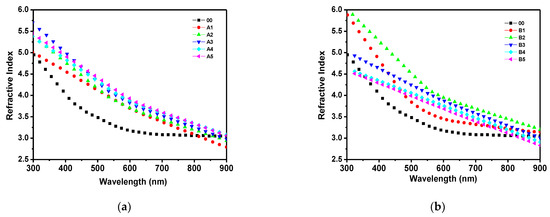 Refractive index vs. wavelength for two series of thin films: (a) n-type films with different H2 and PH3 contents; (b) p-type films with different H2 and B2H6 contents.