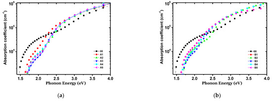 Absorption coefficient vs. phonon energy for two series of thin films: (a) n−type films with different H2 and PH3 contents; (b) p−type films with different H2 and B2H6 contents.