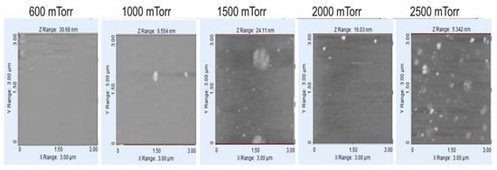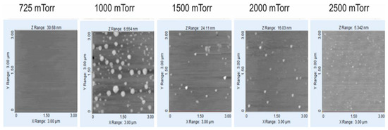 In Figure 6, five images obtained by AFM are shown, corresponding to the morphology of the a-Si:H films deposited over the glass substrate with flows of H2 = 1000 sccm and SiH4 = 50 sccm. In the image, it can be observed that for a pressure of 600 mTorr, there is no evidence of nanoclusters, and they appear from 1000 mTorr, where their quantity increases with the increase in pressure, but their size decreases when the pressure increases. A similar behavior, in a greater quantity of nanoclusters, is seen in the films shown in Figure 7. Figure 8 shows the SEM photo of the sample at 2000 mTorr, where nano-crystals appear that are approximately 1.5 nm in size.