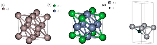 Atomic structure in QM simulations. (a) Aluminum, (b) Nichrome, and (c) MXene.