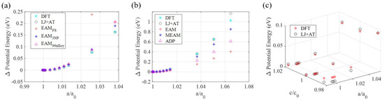 The first comparison, in Figure 2 shows that the energy gaps calculated in MD using the EAM, MEAM, and ADP force fields deviate from energy gaps calculated via QM. The energy determination for the larger strains (>2%) in QM is not considering the occurrence of defects and phase changes since the QM modeling is executed considering a single atomic structure and determines systems energies by altering the lattice parameters. If the atomic configuration changes due to the presence of defects or phase changes, the LJ + AT developed force field model cannot predict the system’s energy accurately anymore, restricting this parametrization scheme’s transferability. The force fields obtained from the cited literature account for defects and phase changes since different configurations from the configuration space are employed in the parametrization process for those models, causing the discrepancies in energy gaps at large strains. Therefore, simulations’ representativity, when employing the newly parametrized LJ + AT force fields, is not expected to be strong for states where the system is excessively strained or temperatures are excessively high.