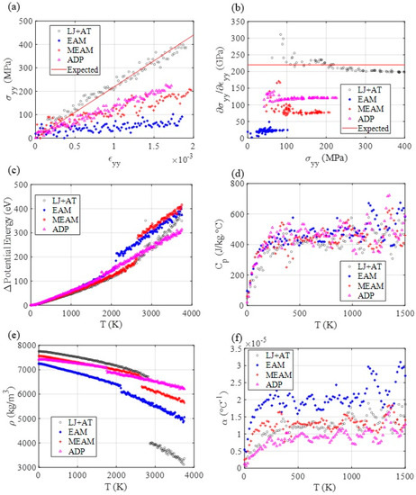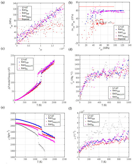 The thermal MD simulation results (Figure 3), indicate that all employed force fields show similar specific heat at constant pressure and similar potential energy evolution through a large temperature interval, where most of the material maintained its starting phase. However, thermal expansion-related properties (thermal expansion coefficient—α and mass density—ρ) can have significantly deviating results. This is mostly explained by the different starting lattice parameters (at ). A larger deviation at larger temperatures for the LJ + AT, when compared with the other EAM potentials, is expected because of the lack of other phases and defects in the parametrization process. Although these differences are present at larger temperatures, the LJ + AT force fields still yielded acceptable results for aluminum’s properties close to room temperature (RT).
