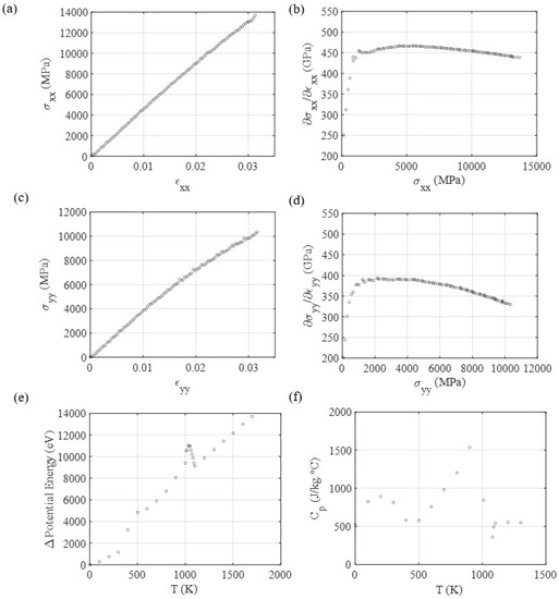 For all the simulations with temperature as the independent variable, we employed a temperature range that was enough to notice phase transitions. For simulations with strain as the independent variable, we employed displacements enough to notice a steady stress-strain evolution and determine the material’s elastic modulus.