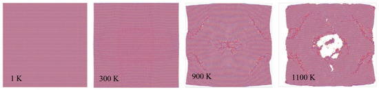 MD simulations for thermal stability (Figure 6) indicate that is thermally stable, without significant occurrences of structural changes and defects until 1000 K, which is in good agreement with the simulation results obtained by Borysiuk and Moshalin [34] and experimental results obtained by Wyatt et al. [35], where they found that between 900 °C and 1200 °C, a new phase () is formed.