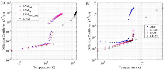 For a temperature range that extends above the melting point of the simulated materials (Figure 7), the diffusion coefficient determined with the LJ + AT parameters approached the results for other EAM force fields. However, the parametrization discussed in this work applies, with a satisfactory fidelity level, to the proposed atomic structure only. For higher temperatures, above the phase change point, there may be a level of atomic structure uncertainties that can make the EAM force field a better choice for MD simulations since EAM’s performance is not conditioned to the atomic structure.