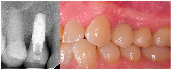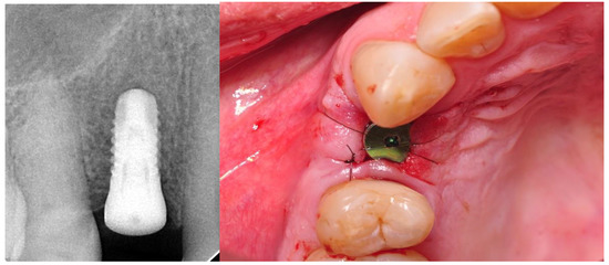 The implant surgery included the antibiotic cover of one-shot therapy—1 dose of clindamycin 600 mg (MIP Pharma, Gdansk, Poland). Choice of implant was based on radiological examination performed during the preconditional visit. The implant’s surface was conditioned due to insertion with an Apliquiq applicator just before the surgical procedure. Local infiltration anesthesia was provided using Septanest 1:100,000 (SEPTODONT 58, Saint Maur des Fossés, France) with the application of the Wand STA device (Milestone Scientific, Inc. Roseland, NJ, USA). First, a diamond drill on the high-speed hand piece was used for deepithelialization. Then, H-shaped papilla-preservation incision, shifted palatially with a blade no. 15C was done. The implant bed was performed following manufacturer recommendations. During that stage, implants were lifted from the Apliquiq applicator. Subsequently, each implant was inserted at bone level according to the procedure provided by the manufacturer. The partially deepitalized flap was repositioned and stabilized with 5-0 simple interrupted sutures (Seralene®, Serag Wiessner, Naila, Germany). At the end of the surgery, an RVG image was done to control the correctness of the implant insertion (Figure 1). The X-ray tubehead was aimed at right angles (vertically and horizontally) to both the implant and the sensor. A paralleling device was used for this purpose. The surgeries were performed by M.K and J.H. Postoperative recommendations included analgesic and anti-inflammatory treatment with Nimesil (Laboratories Menarini SA Barcelona, Spain), 200 mg/per day, and rinsing the oral cavity with Eludril Classic (Pierre Fabre S.A Paris, France) 3 times a day.