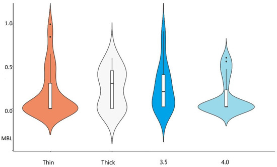 The graphical presentation as a boxplot of MBL results among groups of thick/thin biotype and 3.5/4.0 diameter implants.