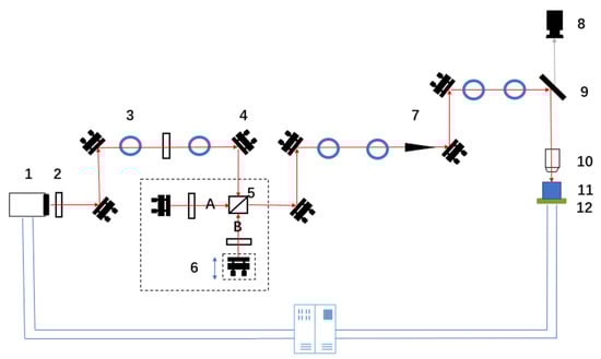 Schematic of the light path in the experiment (1—fs laser; 2—neutral density filter; 3—diaphragm; 4—mirror; 5—beam splitter; 6—one-dimensional linear translation stage; 7—shutter; 8—CCD camera; 9—dichroic mirror; 10—plano-convex lens; 11—sample; 12—six-degrees-of-freedom translation stage).