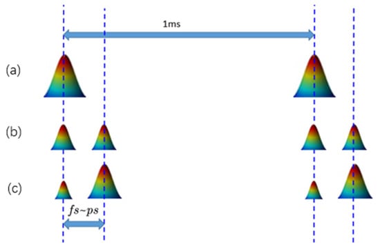 Schematic of the pulses used for ablation, with a single pulse and with double pulses with varying energy ratios: (a)—single pulse; (b)—a double pulse with an energy ratio of 5:5; (c)—double pulses with a different energy ratio (1:9 or 2:8). The maximum repetition rate of the laser was 1 kHz.