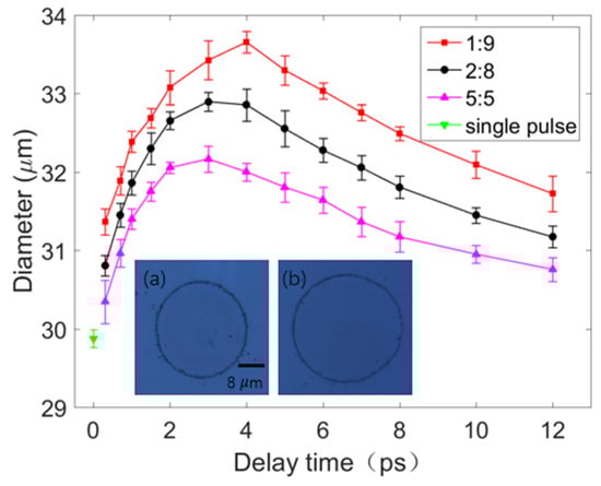 A comparison of the diameters of the craters ablated by the double pulses (with three energy ratios) and single pulse. The red, black, and pink lines represent the results obtained for double pulses with energy ratios of 1:9, 2:8, and 5:5, respectively. The downward green triangle represents the results obtained for the single pulse. Inset (a)—image of a crater ablated by the single pulse; inset (b)—image of a crater ablated by double pulses with an energy ratio of 1:9 and a delay time of 4 ps. Insets (a,b) have the same scale bar.