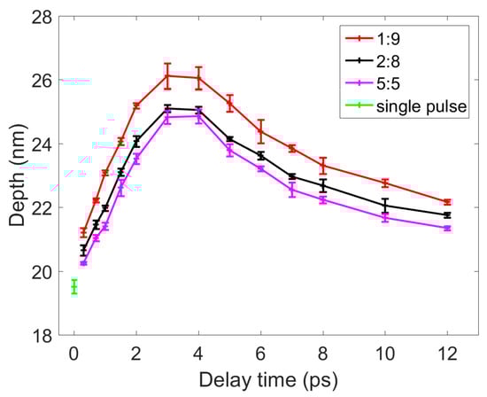 The results displayed in Figure 3 indicate that the maximum diameters of the craters ablated by double pulses with energy ratios of 1:9, 2:8, and 5:5 were 33.66, 32.90, and 32.17 μm, respectively. These maximum diameters were obtained when the delay time was 3–4 ps. The diameter of the craters ablated by the single pulse was 29.65 μm. Thus, the diameter of the craters ablated by the double pulse with a delay time of 4 ps and an energy ratio of 1:9 was up to 14% higher than that of craters ablated by the single pulse. Similarly, as displayed in Figure 4, the maximum depths of the craters ablated by double pulses with energy ratios of 1:9, 2:8, and 5:5 were 26.12, 25.10, and 24.86 nm, respectively. These maximum depths were obtained when the delay time of the double pulses was 3–4 ps. The depth of the crater ablated by the single pulse was 19.51 nm; thus, the depths of the craters ablated by double pulses with a delay time of 3 ps and an energy ratio of 1:9 was up to 34% higher than that of the crater ablated by the single pulse.