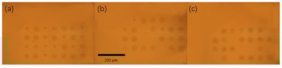 The results of the ablation experiments when the double-pulse delay time was 0 ps: (a)—energy ratio of 1:9; (b)—energy ratio of 2:8; (c)—energy ratio of 5:5. Panels (a–c) have the same scale. The scale bar is 200 μm.