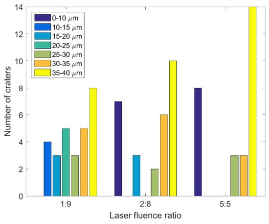 Diameter range histograms of the craters ablated by double pulses with three laser fluence ratios when the delay time was 0 ps.