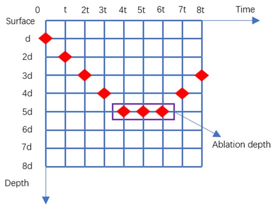 Some studies have indicated that materials can be ablated only when their lattice temperatures reach the following three temperatures: their melting point [35], vaporization temperature [36], or thermodynamic critical temperature [37]. In our simulation, when the lattice temperature exceeds the melting point of a material, the material is ablated. Figure 7 shows the process of calculating the depth of a nickel sample ablated by a femtosecond laser. The minimum unit of the time grid divided by the TTM is t and the minimum unit of the depth grid is divided by d. The ablation depth of the nickel sample is calculated at t, 2t, 3t, etc. When there is a maximum value and an inflection point in the depth value of the ablated nickel sample, the ablation depth of the sample under this parameter (specific delay time and fluence ratio) can be determined. After calculating the ablation depth and the maximum temperature of the lattice under each set of parameters, it was found that the ablation depth is proportional to the maximum lattice temperature. The ablation efficiency of a material is related to the maximum temperature of its lattice [22]. Therefore, only the maximum lattice temperature of the nickel surface must be known in order to determine the ablation efficiency.