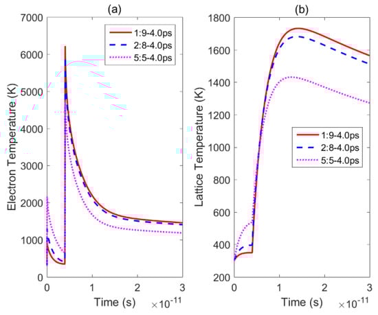 Changes in the lattice and electron temperatures over time under irradiation by double pulses with three energy ratios: (a)—electron temperatures obtained by irradiation with double pulses with a delay time of 4.0 ps and energy ratios of 1:9 (solid red line), 2:8 (dotted blue line), and 5:5 (dotted pink line); (b)—lattice temperatures obtained by irradiation with double pulses with a delay time of 4.0 ps and energy ratios of 1:9 (solid red line), 2:8 (dotted blue line), and 5:5 (dotted pink line).