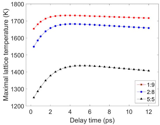 Changes in the maximum lattice temperatures with respect to the delay time for irradiation by double pulses with three energy ratios. The solid red, blue, and black lines represent the results obtained using double pulses with energy ratios of 1:9, 2:8, and 5:5, respectively.