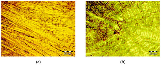 To highlight the metallographic aspects of the CoCrMo and CoCrWNi alloys, samples were cut using the precision cutting machine IsoMet 4000 under a coolant jet. The samples were then hot embedded (195 °C) in phenolic resin, after which they were subjected to grinding and polishing operations using a series of abrasive discs with different granulations (320 to 1000 grit) and fine abrasive powders (alumina alpha 6 to 0.1 μm diameter). The electrochemical attack was carried out in a solution of 2–10 g CrO3 in 100 mL of water at 3 volts for 10 s. Microstructure examination was performed with an Olympus GX51 microscope (Hamburg, 20034, Germany) equipped with AnalySIS image processing software (Munster, Germany, 2007, build 1274).