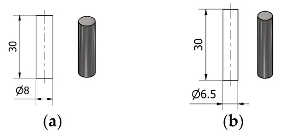 The samples used for the milling tests were prepared in the Cutting Technologies Laboratory of UPB. Taking into account the number of experiments that composed the defined experimental plan, a set of 15 samples was prepared for each analyzed material. The material samples were cut (part off) from rods with the diameters mentioned in the introduction of this section, with the samples’ frontal surfaces being further subjected to the end-milling process. The length of each sample was chosen to be 30 mm (Figure 5).