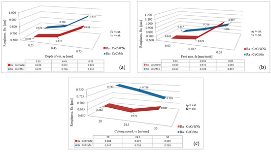 - When maintaining two of the considered process variables at a constant value, it can be observed that the Ra values obtained for machining Co–20Cr–15W–10Ni were predominantly smaller than those obtained for Co–28Cr–6Mo.