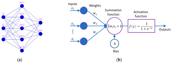 An artificial neural network (ANN) is a computational system that uses a network of functions (nodes) to process data input into a desired output. It was inspired by the biological nervous system; therefore, the network is composed of interconnected elements (nodes) called artificial neurons [21,59,60]. The ANN computational system consists of three layers: the input layer, which contains input neurons that represent input data; the hidden layer, which contains a specific number of hidden neurons; and the output layer, which consists of the output data (the number of neurons is equal to the number of desired outputs). In Figure 7a, the input layer contains 3 neurons: I1, I2, I3, the hidden layer contains 5 neurons: H1:1, H1:2, H1:3, H1:4, H1:5 and the output layer contain 2 neurons: O1 and O2. A general mathematical representation of an individual neuron within an ANN is represented in Figure 7b. The input vector (x1,x2,…xi) is transferred using a connection that multiplies its strength by weights (wi). The output is obtained using a summation function with a specific bias (b) and an activation function. This study used a feedforward neural network with a sigmoidal unipolar activation function [61].