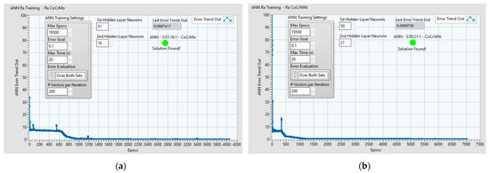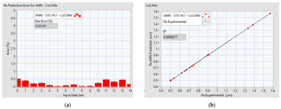 A research investigation performed by Zain et al. [33] indicated that using ANN for Ra prediction gives better results compared to other approaches. For example, while the statistical analysis techniques usually generate good prediction models, sometimes these techniques may not present, with high accuracy, the nonlinear relationship between the cutting parameters and the measurements, while ANN models result in more accurate predictions of the dependent variable than a conventional model because the prediction error is smaller for ANNs [21,33,57].