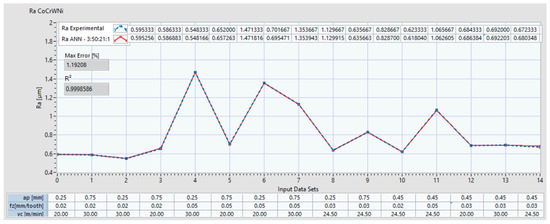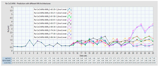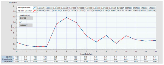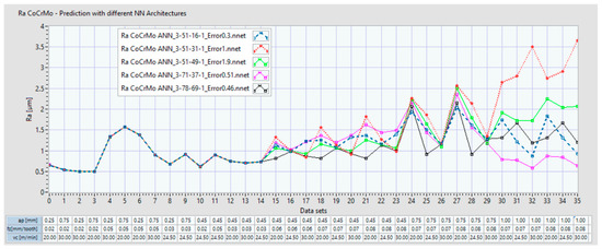 For the Co–20Cr–15W–10Ni alloy, the Ra seems to exceed 2 μm starting with data set 29 for 2 of ANNs. Additionally, it can be observed that the ANN prediction behavior starting with data set 29 became uncertain and varied. We may conclude that when we increase the ap over 0.75 mm, either the Ra may exceed 2 μm or the prediction is not accurate.