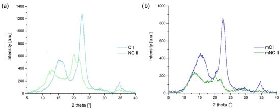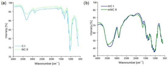 Fourier transform infrared spectroscopy was used to identify the characteristic functional groups that were present in the structure of the samples before and after PEG treatment. Figure 2a shows the spectra of the starting celluloses. Both of the spectra exhibited very similar absorption bands, which confirms that mercerization (transformation of C I into NC II) did not alter the chemical structure of the cellulose. In addition, the observed bands are consistent with the characteristic bands reported in the literature (see Table 2) [34].