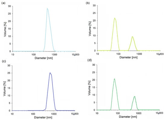 Particle size distribution for: (a) C I; (b) NC II; (c) mC I; and (d) mNC II.
