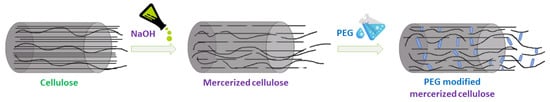 Avicel PH101 (Merck, Darmstadt, Germany) was used as a source of cellulose I. Tin(II) 2-ethylhexanoate (Merck) was used as a catalyst during modification with polyethylene glycol, with Mw = 1000 (Merck). Pure NaOH (Chempur, Piekary Śląskie, Poland) was used for the preparation of a 16% solution—the mercerizing agent.