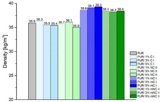 The use of various types of fillers for rigid foams can affect the free density of the materials obtained. The effect of cellulosic fillers on this parameter is shown in Figure 6.