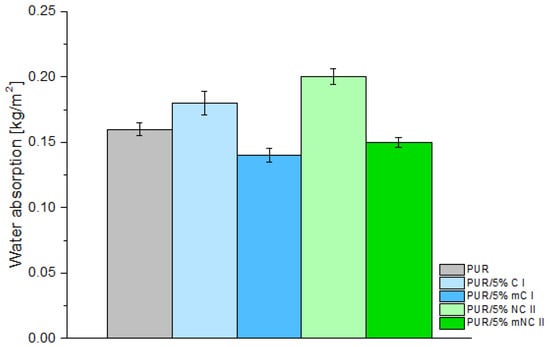 The water sorption parameter is extremely important since commercial PUR foam cannot soak up water. The susceptibility to water absorption may intensively affect the thermal insulation and mechanical characteristics of the final PUR product. Therefore, the next step of this study was to determine the water absorption properties.
