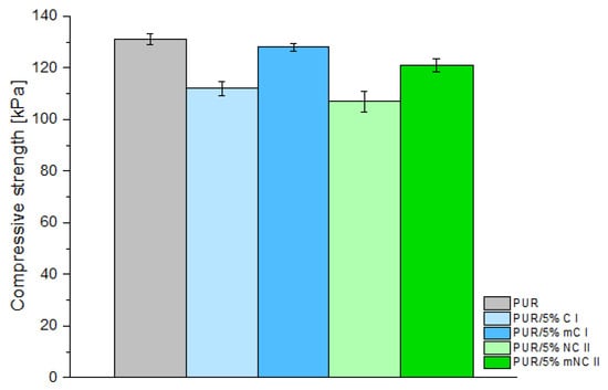 Członka et al. [45] reported that the addition of 5% walnut shell to polyurethane reduces this parameter by ca. 11%. Silva et al. [7] investigated rigid foams with cellulose fibers. They concluded that, when compared to unfilled sample, the decrease in compressive strength for these composites was not greater than 7%, which is very similar to our result. Such decrease in the value of compressive strength is not significant in terms of the commercial applications of PUR foams.
