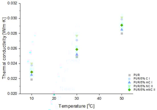 Rigid polyurethane foams are used as thermal insulation materials; therefore, one of their most important parameters is thermal conductivity [48]. The basic parameter for the assessment of these properties is the thermal conductivity coefficient (the λ parameter). Figure 9 presents the values of this parameter for PUR and its composites.