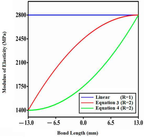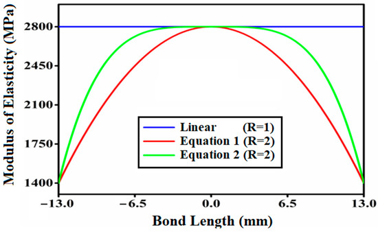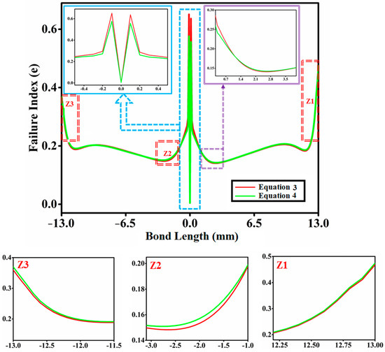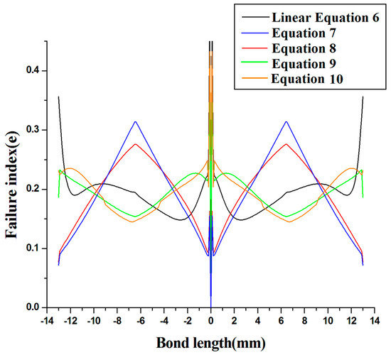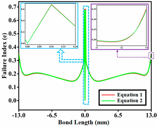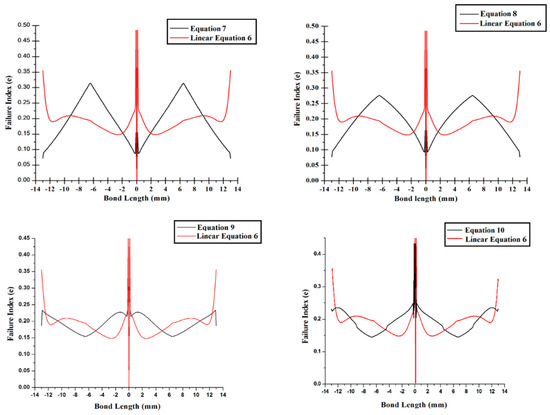 - In Case II, several profiles of even power law are compared to the linear Equation (6), and it is determined that Equation (9) is a superior functional graded adhesive joint because it reduces stress concentration at the side joints, with a failure index of 0.25 at bond lengths of −13 mm and 13 mm. The stress accumulation at the juncture’s center was found to be less, up to 0.3, as compared to the linear profile Equation (6) and distinct even power law Equations (7)–(10). Although this may be ignored, it has also been discovered that the components of the FGM graded by Equation (9) will lessen stress accumulation at the side and center of the joint.
