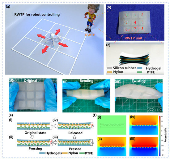 Structure design and working principle of RWTP: (a) schematic of real-time control of a robot; (b) image of an as-fabricated RWTP; (c) layer-by-layer structure of RWTP unit; (d) images of RWTP in its (i) original, (ii) bending, and (iii) twisting states; (e) working principle of RWTP; (f) potential simulations by COMSOL to elucidate the working principle (i) original state, (ii) pressing state (iii) pressed state and (iv) released state.